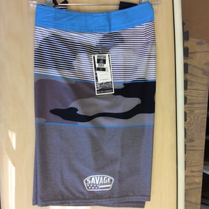 Savage 4-way stretch Board Shorts Black/Grey Camo w/ White/Blue Stripes